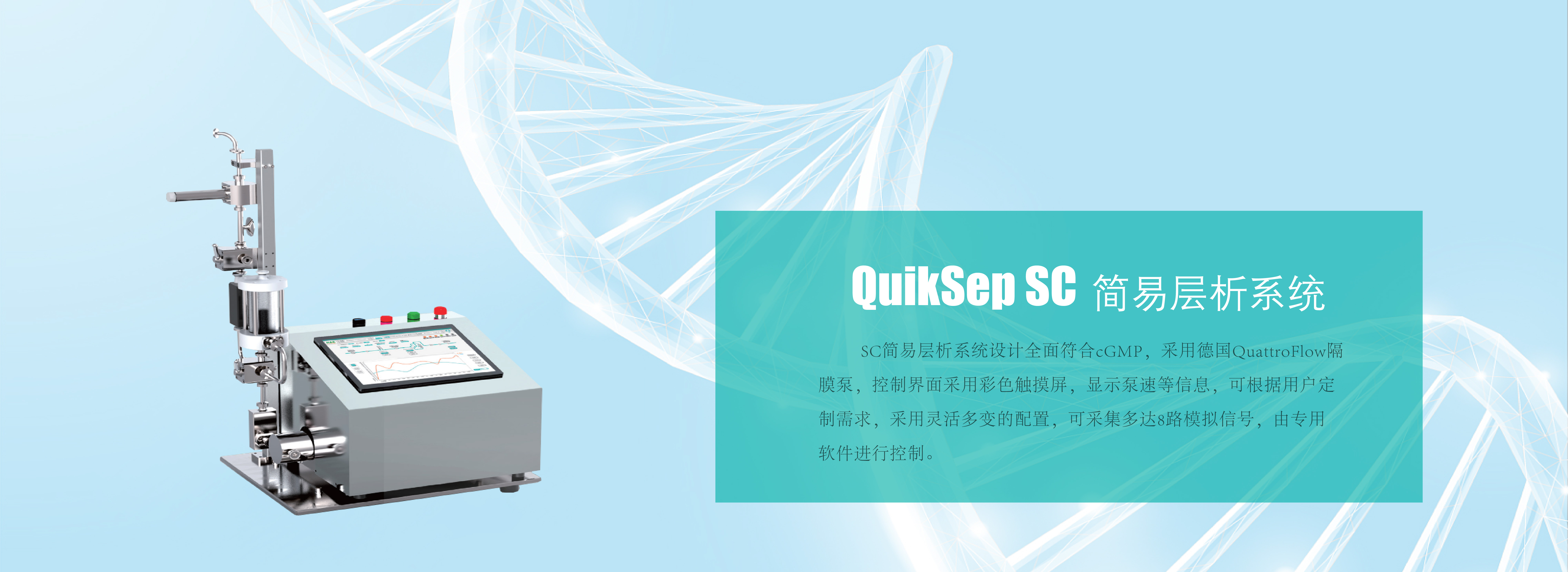 慧德易QuikSep SC簡易層析系統是采用衛生級隔膜單泵設計,配合在線非接觸式超濾波流量計,可在線監測流量、UV、電導、pH、壓力、溫度,手動柱位閥、氣泡陷阱閥為由衛生閥門,是為中試和工業級生物制品純化而專門設計的層析系統