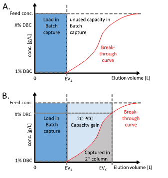 圖2.普通層析和PCC載量利用率對比圖。圖A為批處理上樣。在批處理的捕獲過程中,當(dāng)樣品出現(xiàn)流穿時,上樣必須結(jié)束,從而避免樣品損失。圖B:在2C-PCC連續(xù)上樣階段,第1根層析柱進行上樣,直至出現(xiàn)流穿(例如70%流穿),流穿樣品被第2根層析柱捕獲。因此,第1根層析柱的載量利用率得到顯著提高。
