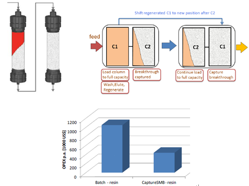 傳統(tǒng)層析工藝,由于流穿效應,有30-50%的填料是無法被完全利用的,從而使得載量和處理量大為受限。Capture SMB用于優(yōu)化捕獲環(huán)節(jié),作為最簡單和最強大的2柱位設計,可使純化效率顯著提高,并且使填料用量大為縮減。