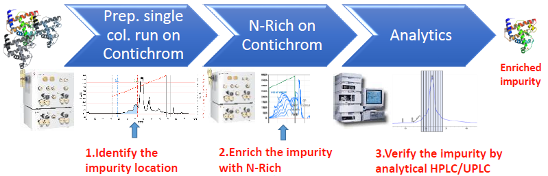 N-Rich工藝是微量物質(zhì)的富集過程,比如將產(chǎn)品的相關雜質(zhì)選擇性地富集在一個循環(huán)的層析過程中,待富集至目標量,再進行洗脫回收。該方法特別適用于分離與產(chǎn)品有關的雜質(zhì),如異構體和聚集體,并同時用于發(fā)現(xiàn)研究。