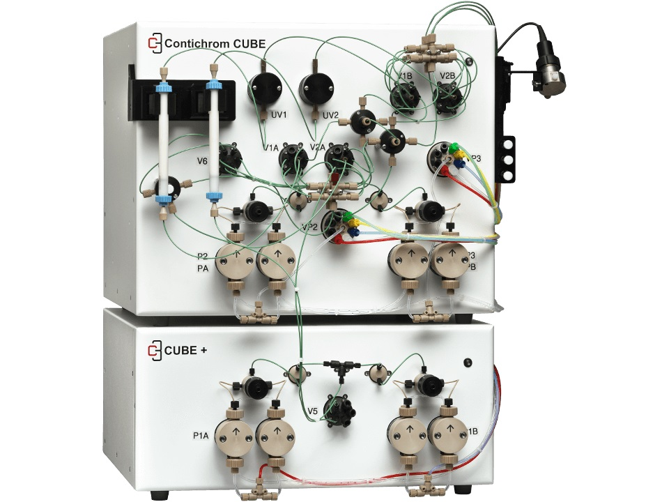 所有的Contichrom系統(tǒng)可以將兩個層析步驟(例如捕獲和精純)整合為一個單一的過程,第一步層析洗脫的產(chǎn)物可以直接被稀釋,從而直接進行第二步層析,因此省略了中間的間歇過程,這是非常適用于高生產(chǎn)量純化的。