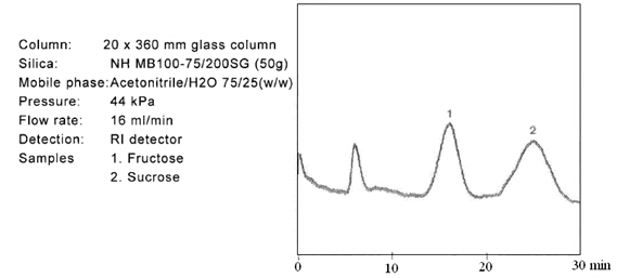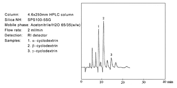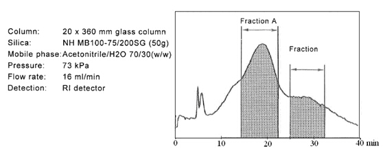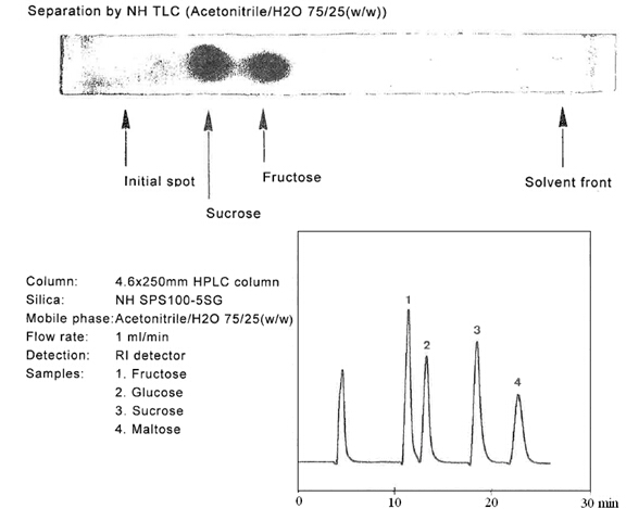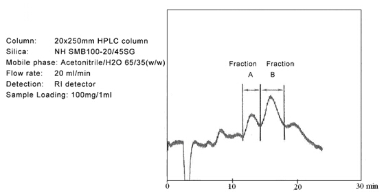 ? ? ? 糖類(lèi)物質(zhì)的分析和制備,在液相色譜領(lǐng)域占有重要的地位。迄今為止,大多數(shù)的分離介質(zhì)僅僅局限在分析級(jí)別。但是富士硅膠研發(fā)出用于制備色譜的新的氨基硅膠。當(dāng)使用高水相為流動(dòng)相時(shí),一般的氨基填料會(huì)暴露出很多問(wèn)題。氨基硅膠的pH值很高,一般pH為9.0,在這樣高的pH條件下,目標(biāo)化合物一般都會(huì)變性,并且會(huì)毀壞硅膠基質(zhì)的表面。考慮到這些問(wèn)題,富士公司研發(fā)出新的氨基硅膠填料,稱(chēng)之為NH SG硅膠。NH SG硅膠可以最小化甚至是避免上述問(wèn)題,并且對(duì)糖類(lèi)化合物進(jìn)行更好的分離。