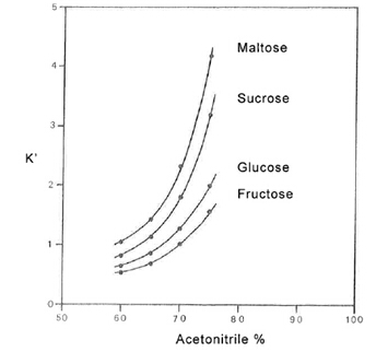 糖類(lèi)的分離通常用到的是乙腈/水做流動(dòng)相。當(dāng)乙腈的含量增加,保留因子k’增加。但是乙腈的含量需要仔細(xì)的控制,因?yàn)殡S著乙腈含量的增加,樣品的溶解性會(huì)變差。