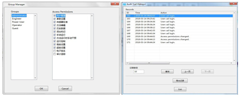 系統(tǒng)采用五級(jí)用戶管理權(quán)限,可對用戶權(quán)限進(jìn)行自定義分配,并可在運(yùn)行中更換用戶(便于交接班)。完善的審計(jì)追蹤及電子簽名功能,符合cGMP法規(guī)要求。