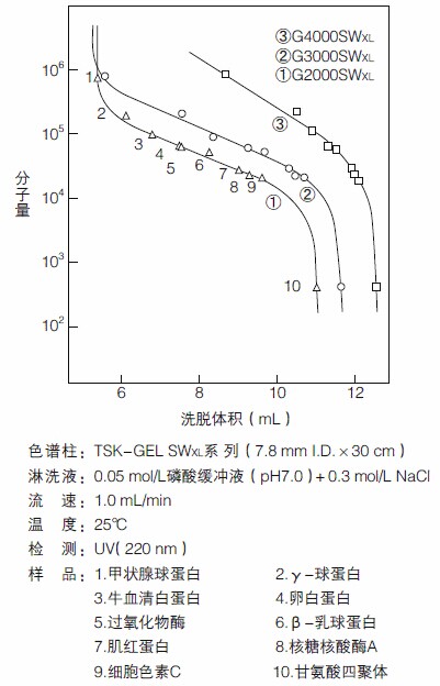 1. TSKgel SW-型填料由含二醇基官能團的剛性球形硅膠顆粒組成。