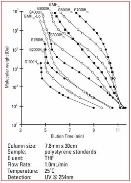 4. Hxl型柱屬于常規(guī)GPC色譜柱,尺寸為7.8mm ID ×30cm。大多數(shù)HPLC系統(tǒng)無(wú)需進(jìn)行特殊的優(yōu)化(針對(duì)柱外峰展效應(yīng)),即可使用常規(guī)的GPC色譜柱。