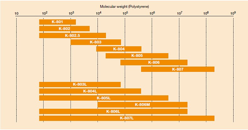 GPC K-803是標準的油溶性SEC色譜柱,適用于從低分子量到高分子量的寬范圍的樣品。流動相是氯仿。