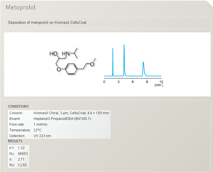 ? 纖維素衍生物手性固定相CelluCoat,以Kromasil高純硅膠為基質,表面涂敷有纖維素-三(3,5- 二甲苯基氨基甲酸酯)。 Kromasil CelluCoat的手性固定相和Daicel CHIRALPAK OD/OD-H 的固定相完全相同,而CelluCoat采用的高純硅膠和全新鍵合技術,使其在分離度、選擇性、耐受壓力和柱壽命方面表現出完美的性能。Kromasil CelluCoat是應用范圍最廣的手性固定相,許多化合物都能達到基線分離。