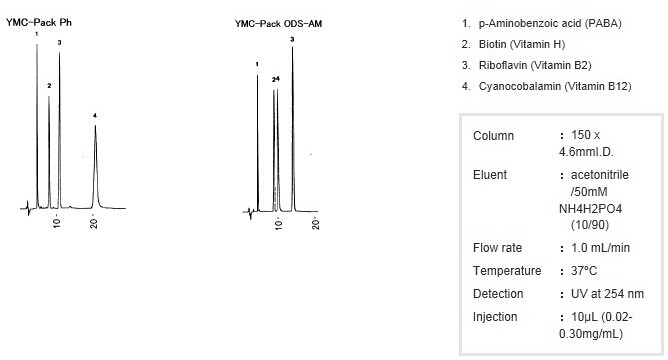 (不同于ODS選擇性的色譜柱) YMC-Pack Ph 是一款具有苯基官能團由來的π電子的色譜柱。對于諸如芳香族化合物的分離,由于除了疏水性相互作用以外,還有固定相和溶質之間π-π電子間相互作用的幫助,因此顯示出不同于包含ODS在內的烷基硅膠基質固定相的分離特性。